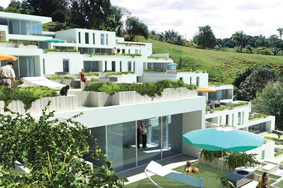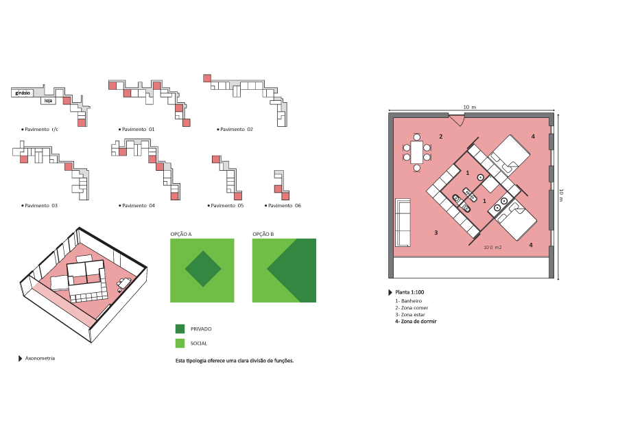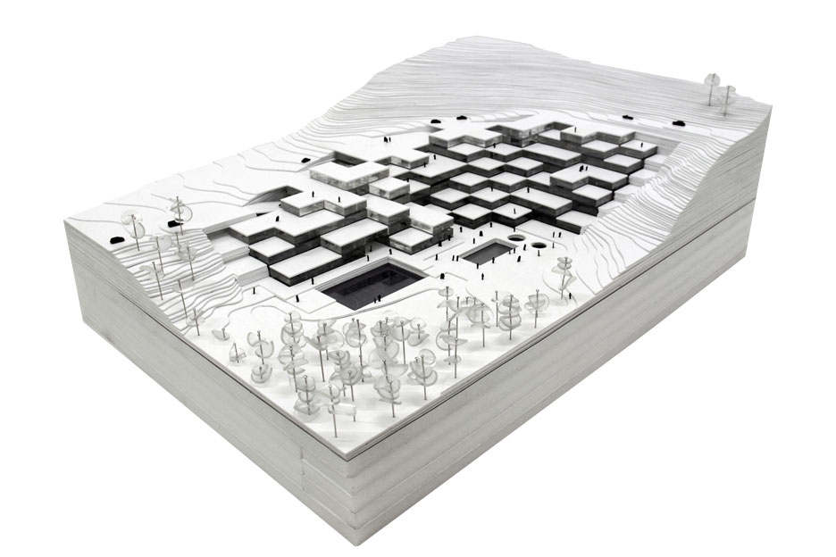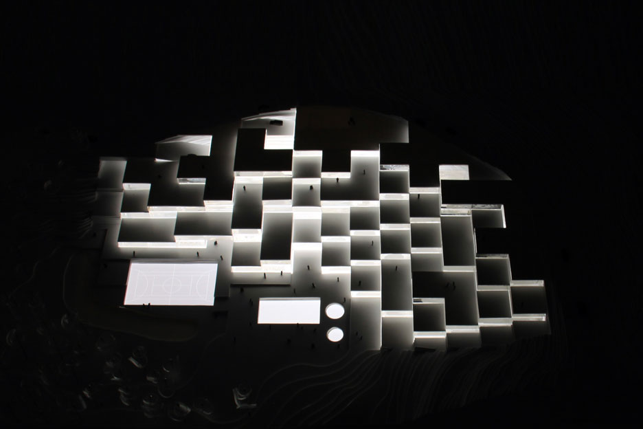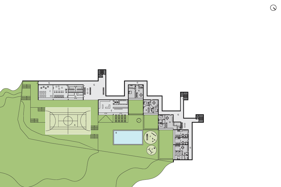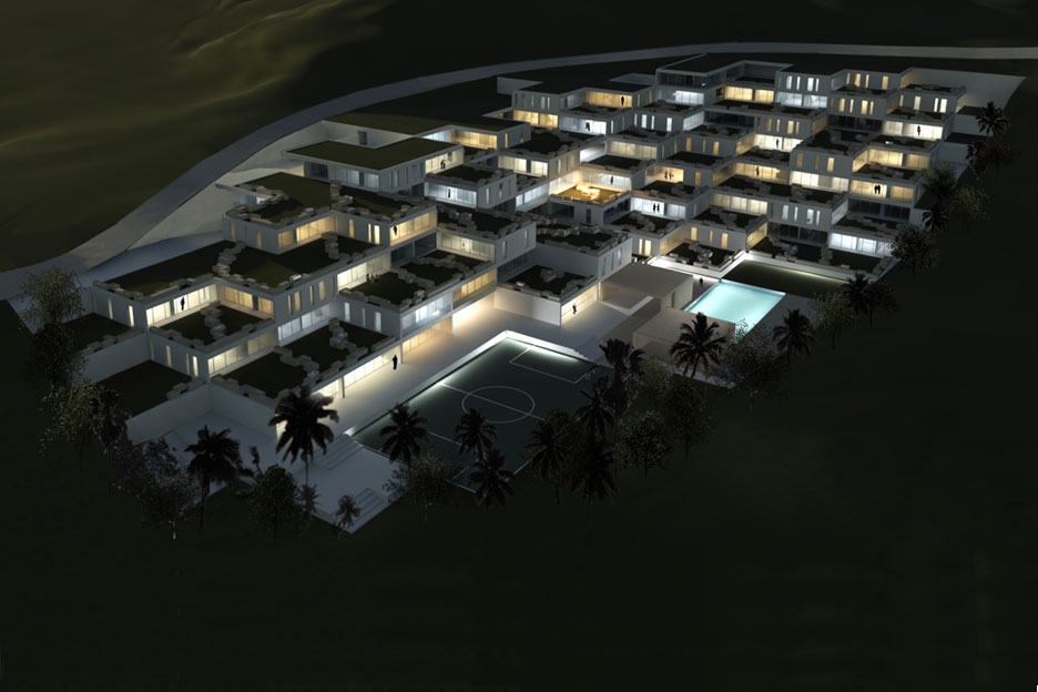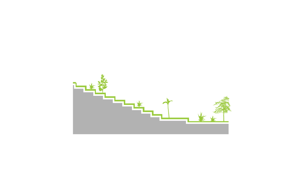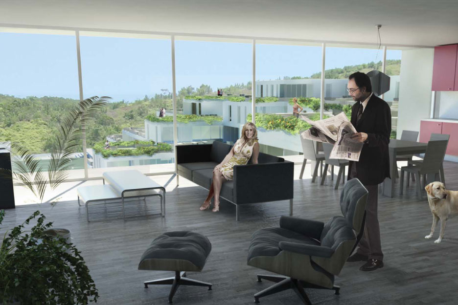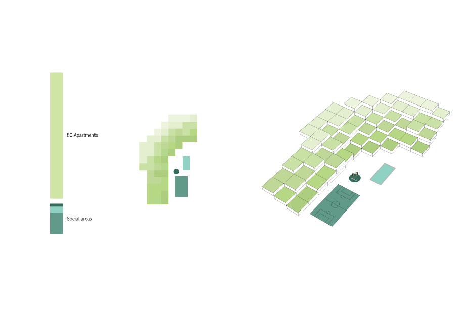 Soccer field, swimming pool, gym, bar, kids area; are combined on the bottom floor. The parking is situated at a back of house, at the height of the road's entrance. As the floor rises, the residential units become fewer, and the green terraces take over…