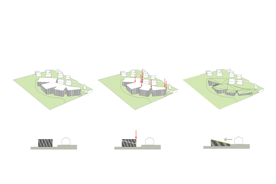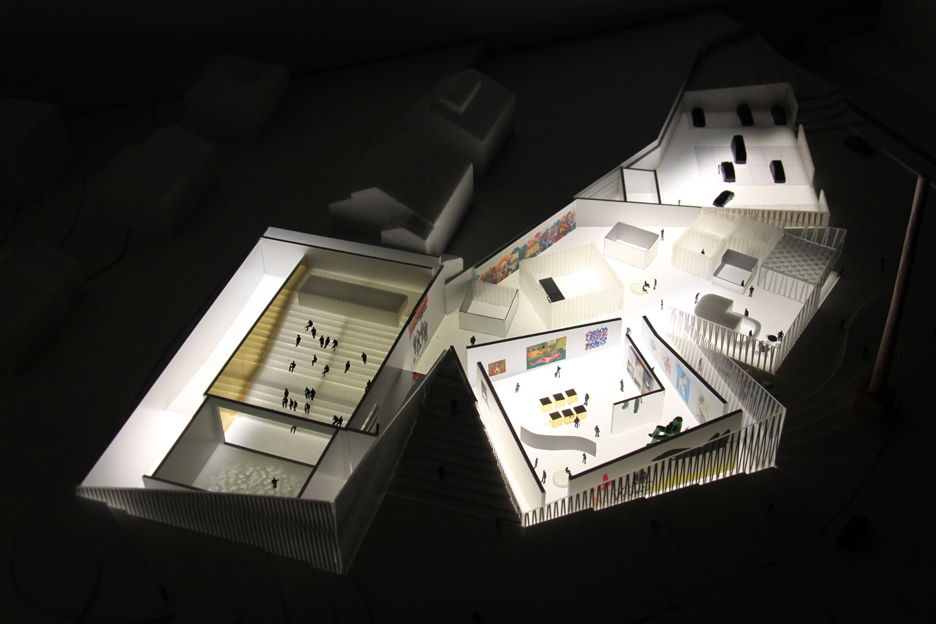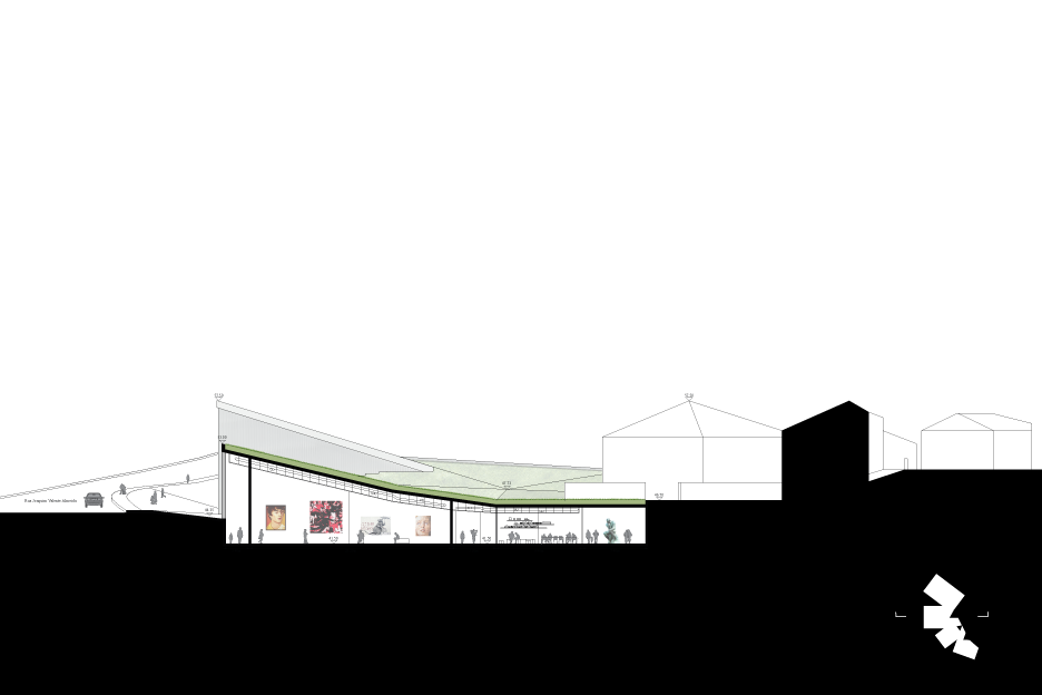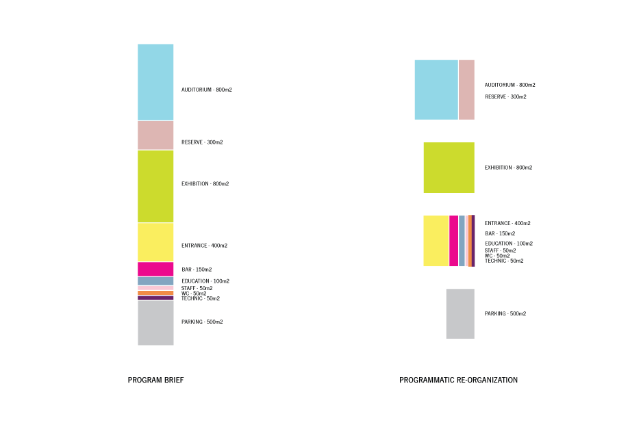 The block height follows the topography while adapting to each specific program. The exhibition hall grows from the inside to the outside, setting up the possibility for larger art works, closer to the facade…