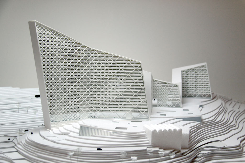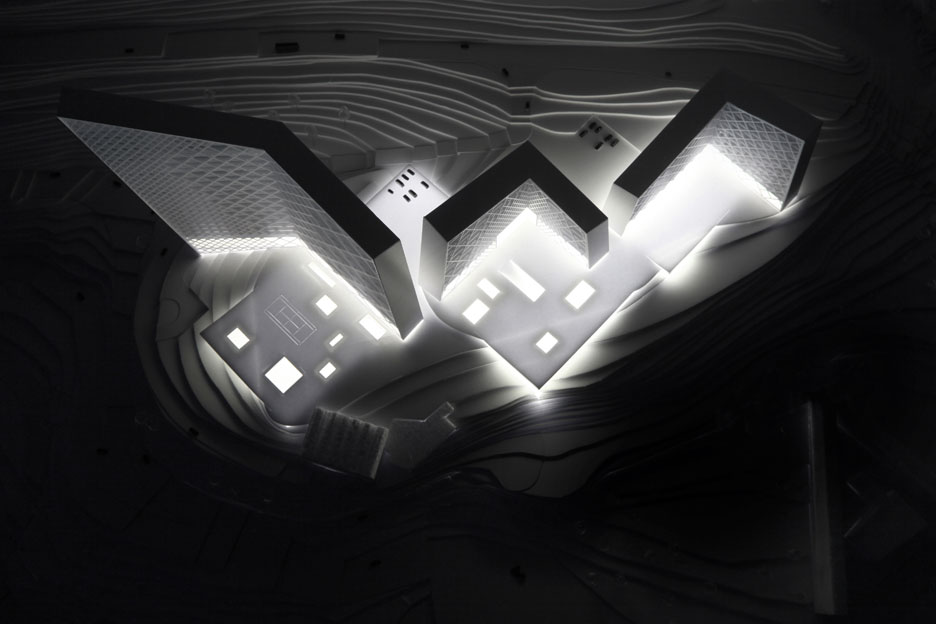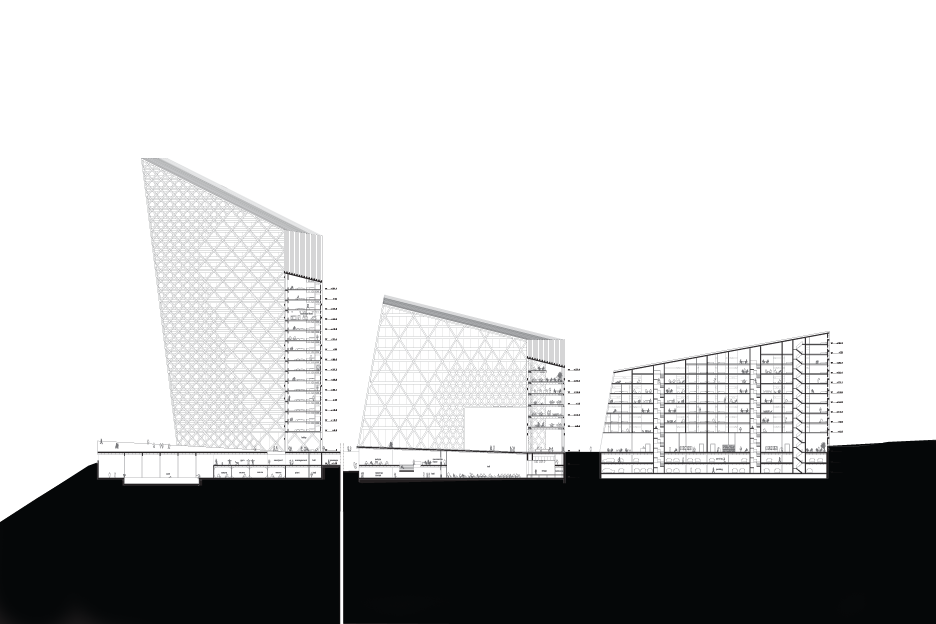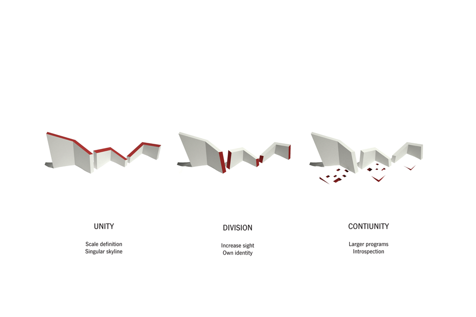 Folding the slabs, doubles the sizes of the program, and increases structural stability, creating urban pockets blocked from the wind. The three buildings are given a continuous roof-line, and the large common program is integrated within the landscape…