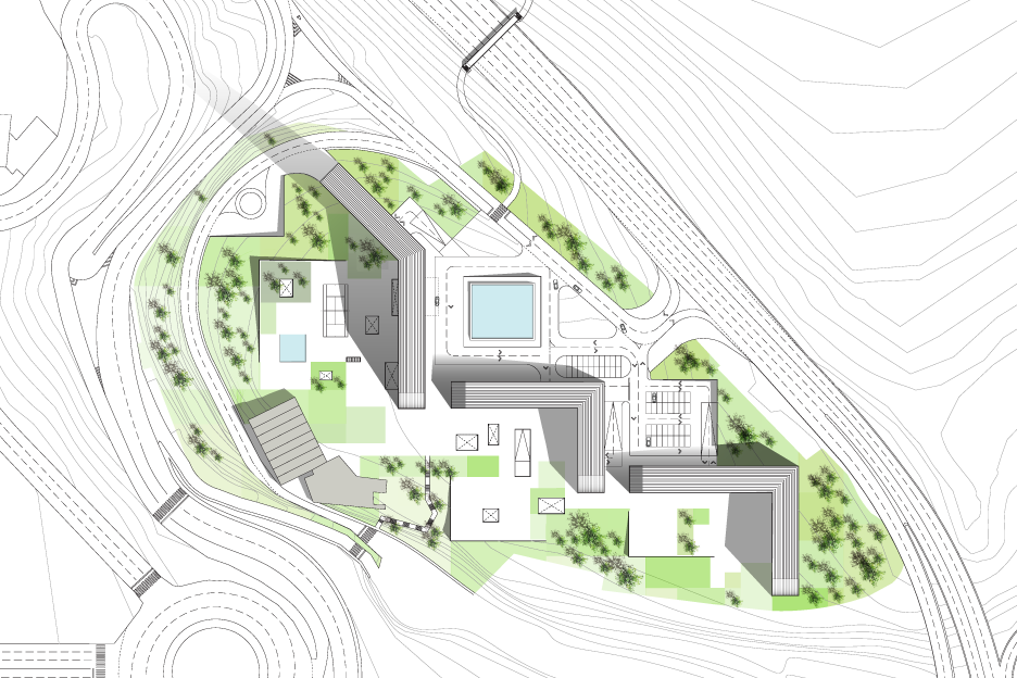 The site plan enhances the duality between the buildings rigidness and the fluidity of the multiple programmatic plateau and surrounding landscape…
