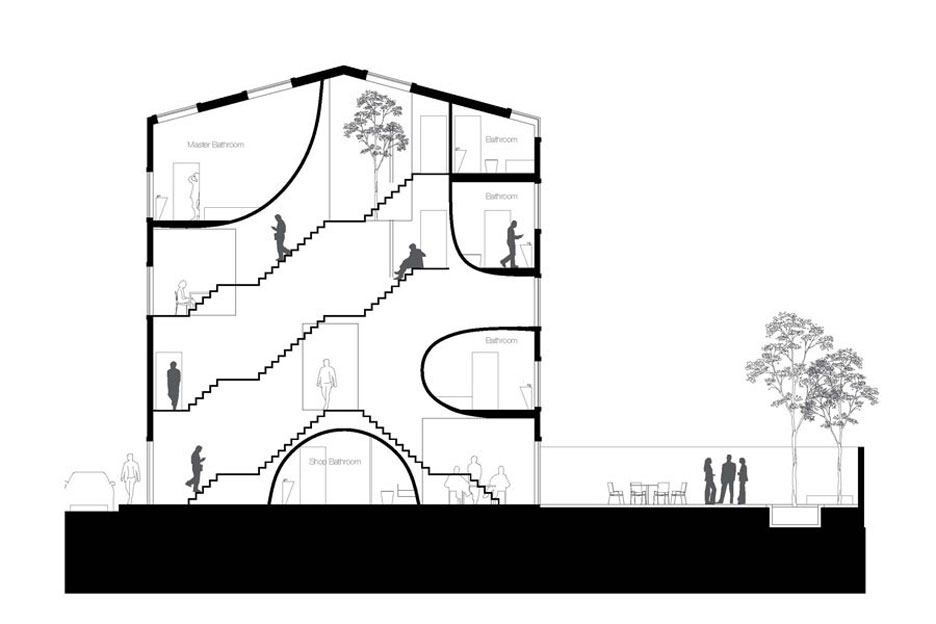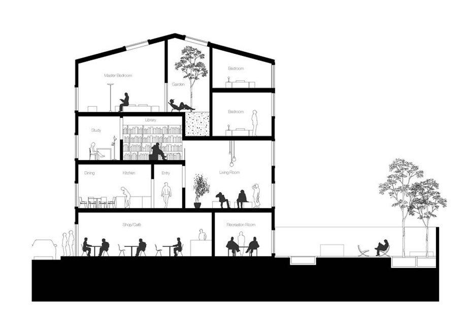 The ground floor is programmatic flexible, whether a commercial space, garage, or another residential floor. The inner garden can be part of the commercial area or be absorbed by the residential realm…