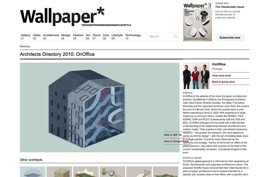ONOFFICE was nominated as one of the 30 upcoming young architecture offices, for the 2010 Wallpaper´s Design Directory. The project was presented at the Metz Pompidou, along with the other emerging fellow architects.